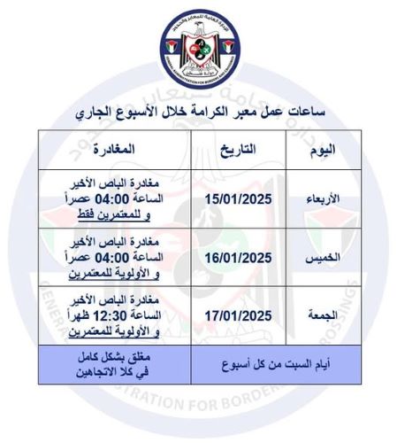 أمد/ أريحا: أعلنت الإدارة العامة للمعابر والحدود، مساء يوم الثلاثاء، ساعات عمل معبر الكرامة، خلال الأيام الثلاثة المقبلة، على النحو التالي:-