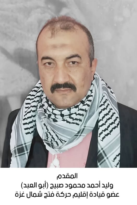 حركة فتح إقليم شمال غزة – قلعة الش/هيد القائد / جمال أبو الجديان تنعي فقديها وفقيد الوطن الأخ المناضل / وليد أحمد محمود صبيح (أبو العبد) عضو قيادة إقليم شمال غزة والذي است/شهد أثناء تلقيه العلاج بجمهورية مصر العربية.