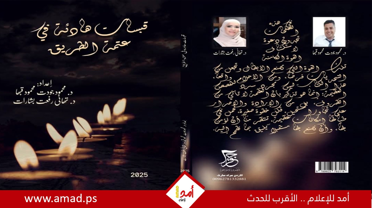 أمد/ عمان: صدر حديثًا عن "جُفرا ناشرون وموزعون" في عمّان، الأردن، كتابٌ بعنوان "قبسات هادئة في عتمة الطريق"، من تأليف كلٍّ من الدكتور محمود جودت محمود قبها والدكتورة تهاني رفعت بشارات، وهو عملٌ أدبيٌّ وفكريٌّ جامع، ينسج من خيوط القصص الإنسانية والدينية والتاريخية قبسات من النور تلامس الوجدان، وتوقظ في النفس شعلة التأمل والسعي نحو المعاني الكبرى.