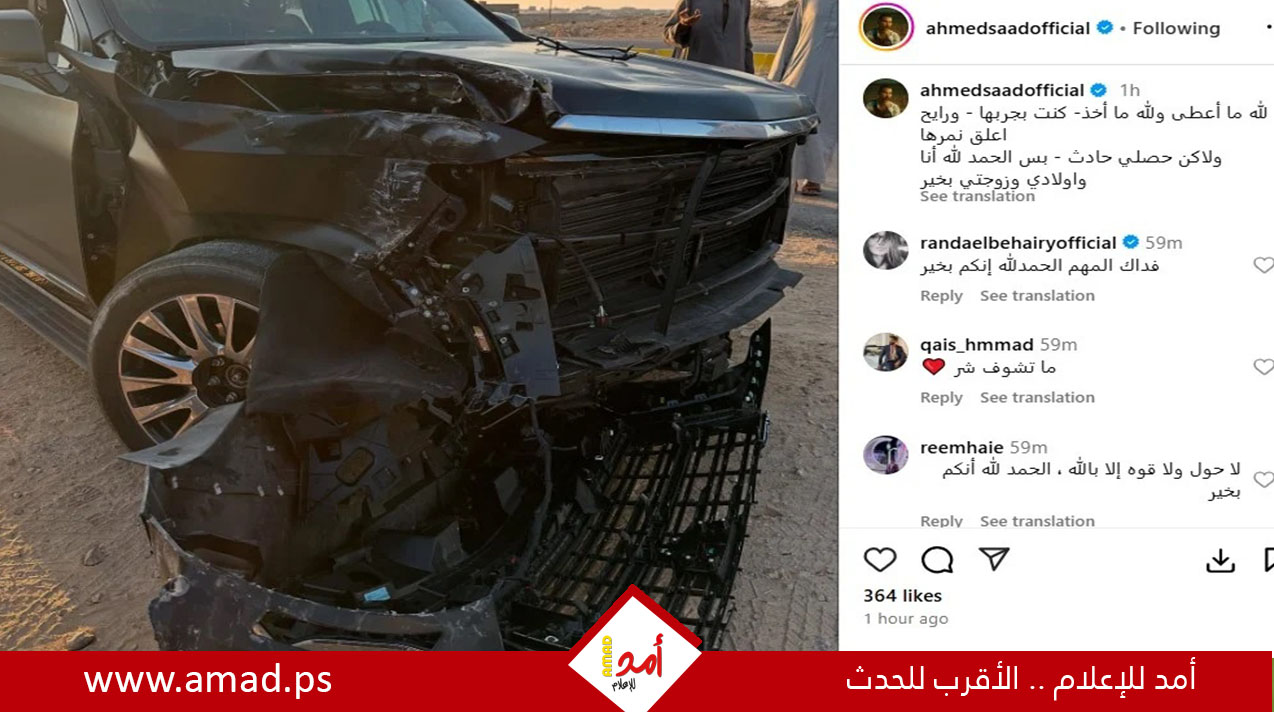 أمد/ كشف النجم أحمد سعد عن تعرضه لحادث سير بسيارته الجديدة أثناء تجربته لها، مشيرا إلى أنه بخير هو وأولاده وزوجته.