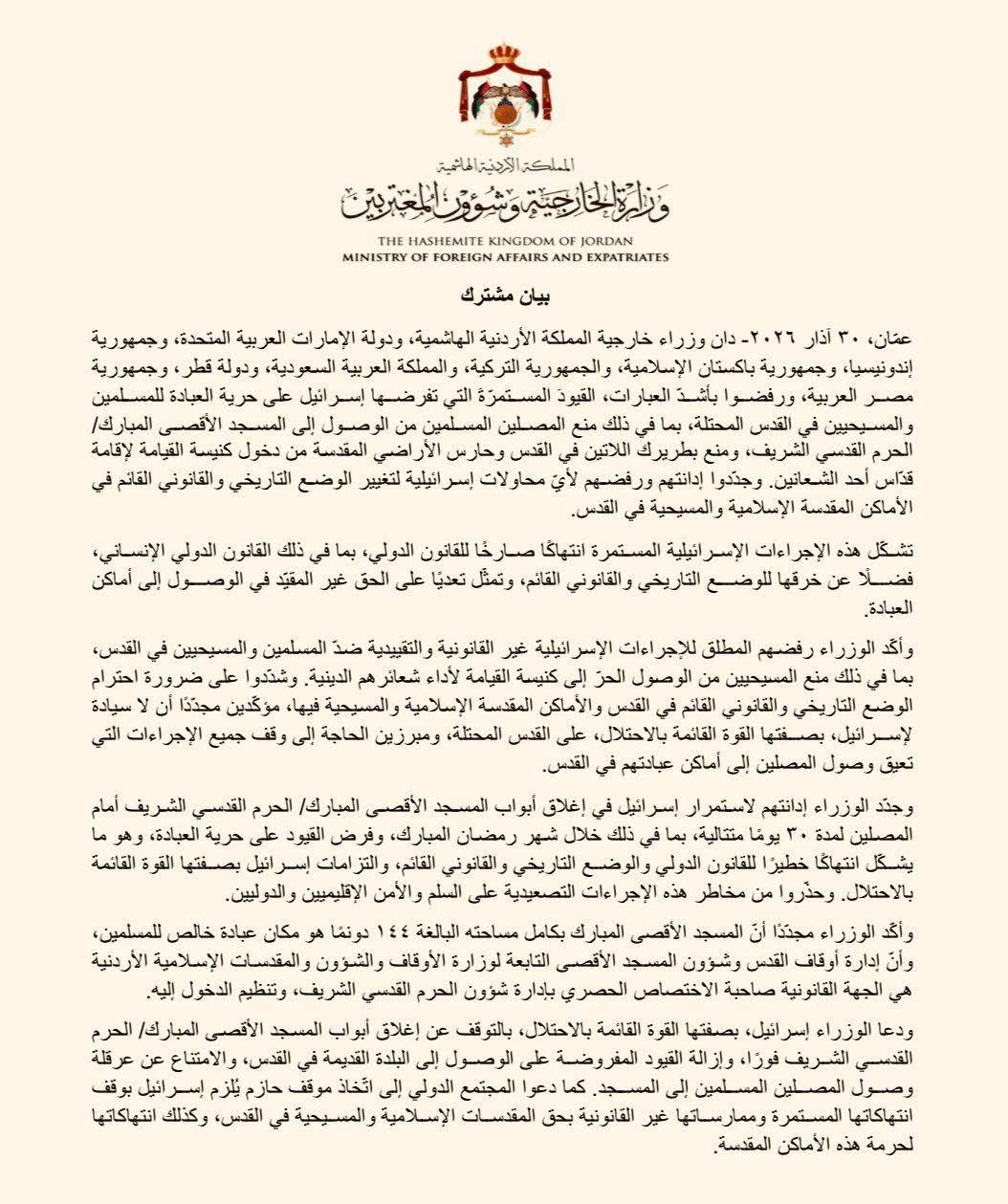 وجدّد الوزراء إدانتهم لاستمرار إسرائيل في إغلاق أبواب المسجد الأقصى المبارك/ الحرم القدسي الشريف أمام المصلين لمدة 30 يوما متتالية، بما في ذلك خلال شهر رمضان المبارك، وفرض القيود على حرية العبادة، وهو ما يشكل انتهاكا خطيرا للقانون الدولي والوضع التاريخي والقانوني القائم، والتزامات إسرائيل بصفتها القوة القائمة بالاحتلال.