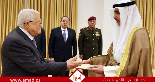 رام الله: تقبل رئيس دولة فلسطين محمود عباس، أوراق اعتماد سفير دولة الكويت لدى دولة فلسطين، السفير حمد بن راشد المري.