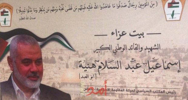 رام الله:أقامت اللجنة التنفيذية لمنظمة التحرير الفلسطينية مساء يوم الأحد، بيت عزاء لرئيس المكتب السياسي لحركة "حماس"، رئيس الوزراء الأسبق إسماعيل هنية، وذلك في مقر جمعية الهلال الأحمر الفلسطيني بمدينة البيرة.