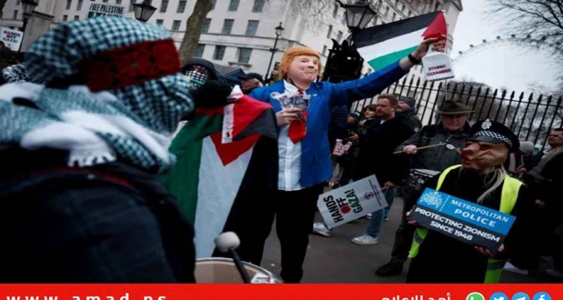لندن: تظاهر آلاف المؤيدين للفلسطينيين أمام السفارة الأميركية في لندن يوم السبت احتجاجا على خطة الرئيس دونالد ترامب للسيطرة على غزة وترحيل سكانها.