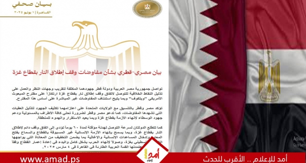 القاهرة – أكدت جمهورية مصر العربية ودولة قطر في بيان مشترك،يوم الأحد، استمرار جهودهما المكثفة لتقريب وجهات النظر وتذليل العقبات في مفاوضات وقف إطلاق النار بقطاع غزة. جاء ذلك في بيان مشترك يرتكز على مقترح المبعوث الأمريكي "ويتكوف"، ويهدف إلى استئناف المفاوضات غير المباشرة.