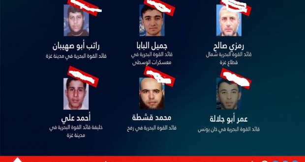 وقال البيان، إن المستهدفين هم "راتب أبوصهيبان قائد القوة البحرية في مدينة غزة، وخليفته أحمد علي، إضافة إلى رمزي صالح قائد القوة البحرية شمال قطاع غزة، وجميل البابا قائد القوة البحرية في معسكرات الوسطى، ومحمد قشطة قائد القوة البحرية في رفح، وعمر أبوجلالة قائد القوة البحرية في خانيونس".