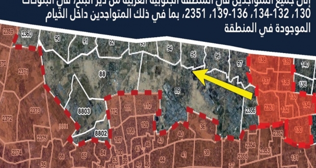 وشمل الإشعار عدة تجمعات سكنية وخياما أقامها نازحون في المنطقة خلال الأسابيع الماضية، حيث طلب جيش الاحتلال من السكان التوجه جنوبا نحو منطقة "المواصي".
