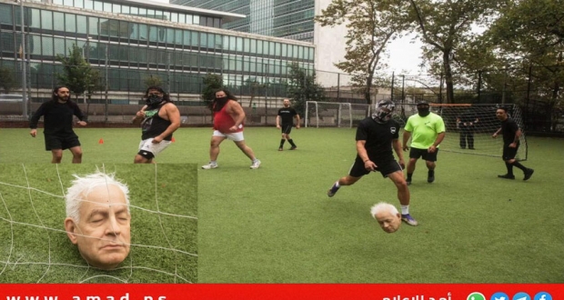 نيويورك: نظّم ناشطون مؤيدون لفلسطين مباراة كرة قدم أمام مقر الأمم المتحدة في نيويورك، استخدموا خلالها كرة على شكل رأس لرئيس الوزراء الإسرائيلي بنيامين نتنياهو، في إشارة للتعبير عن غضبهم من العدوان الغاشم على قطاع غزة.