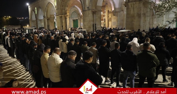 القدس: أدى نحو 60 ألف مصلٍ، مساء يوم السبت، صلاتي العشاء والتراويح في رحاب المسجد الأقصى المبارك.