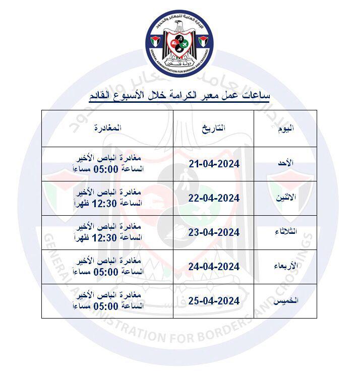 أمد/ أريحا: أعلنت الإدارة العامة للمعابر والحدود، عن تعديل ساعات العمل على معبر الكرامة للأسبوع المقبل، وإغلاقه أمام المسافرين يوم السبت 20 نيسان/ ابريل.
