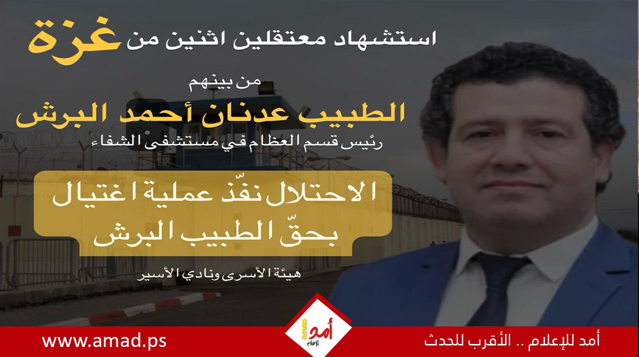 أمد/ رام الله: أعلنت هيئة شؤون الأسرى والمحررين ونادي الأسير الفلسطيني، عن استشهاد اثنين من معتقلي غزة وهما: الدكتور عدنان أحمد عطيه البرش (50 عامًا) من جباليا، وهو استشاري ورئيس قسم العظام في مستشفى الشفاء في غزة.