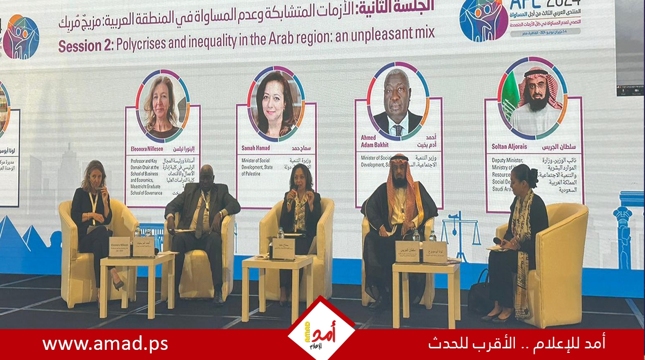 أمد/ القاهرة: شاركت دولة فلسطين ممثلة بوزارة التنمية الاجتماعية، في أعمال المنتدى العربي الثالث من أجل المساواة تحت عنوان "التصدي لعدم المساواة في ظل الأزمات المتعددة"، والذي أقيم في العاصمة المصرية القاهرة لمدة يومين.