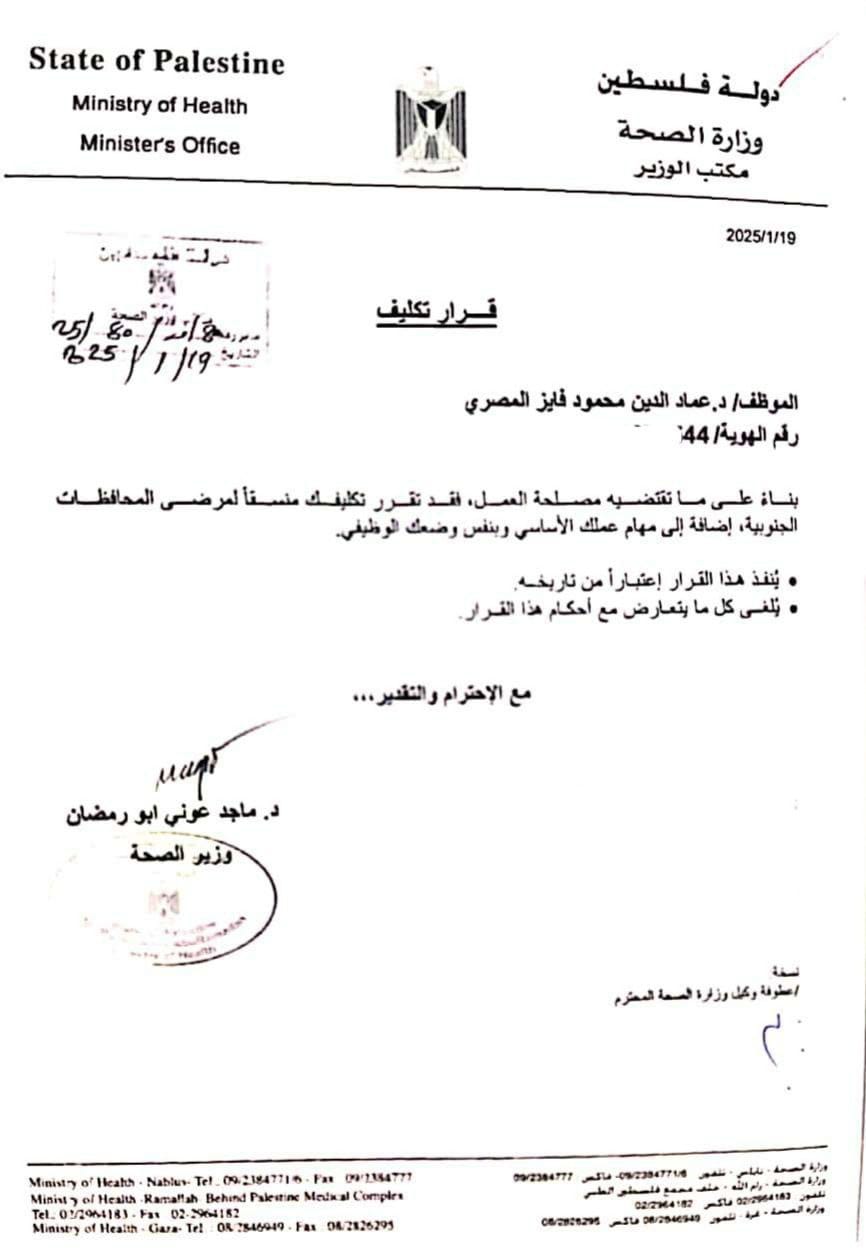 أمد/ أصدر وزير الصحة الفلسطيني، الدكتور ماجد عوني أبو رمضان، قرارًا يقضي بتكليف الدكتور عماد الدين محمود فايز المصري بمنصب منسق لمرضى المحافظات الجنوبية، إلى جانب مهامه الأساسية.