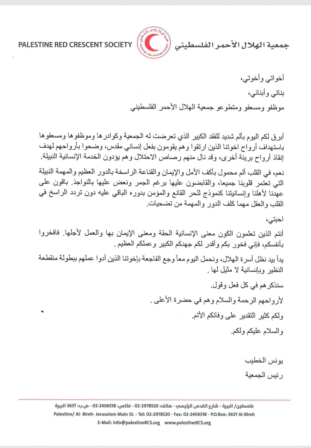 نص رسالة الدكتور رئيس جمعية الهلال الأحمر الفلسطيني يونس الخطيب: