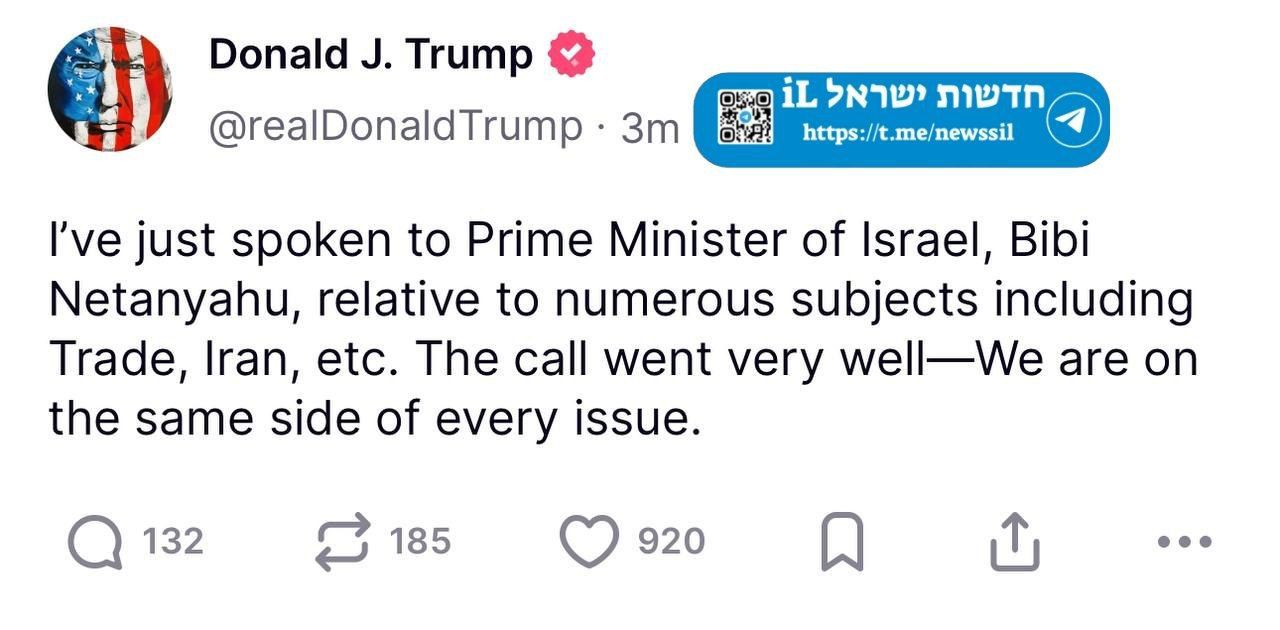 وقال ترمب في منشور على منصته "تروث سوشيال": "تحدثت للتو مع رئيس الحكومة الإسرائيلية، نتنياهو، بشأن عدد من القضايا، بما في ذلك التجارة، وإيران وغيرها".