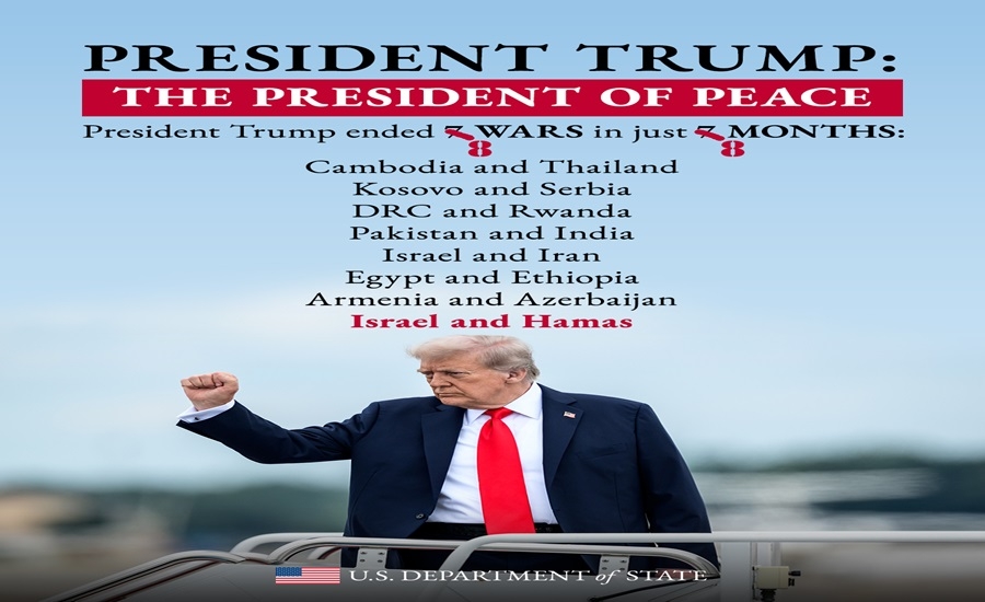 أمد/ واشنطن: نشرت وزارة الخارجية الأمريكية تدوينة عبر منصة "إكس"، وصفت فيها الرئيس الأمريكي دونالد ترامب بـ"رئيس السلام"، وأنه أنهى 8 حروب خلال 8 أشهر فقط.