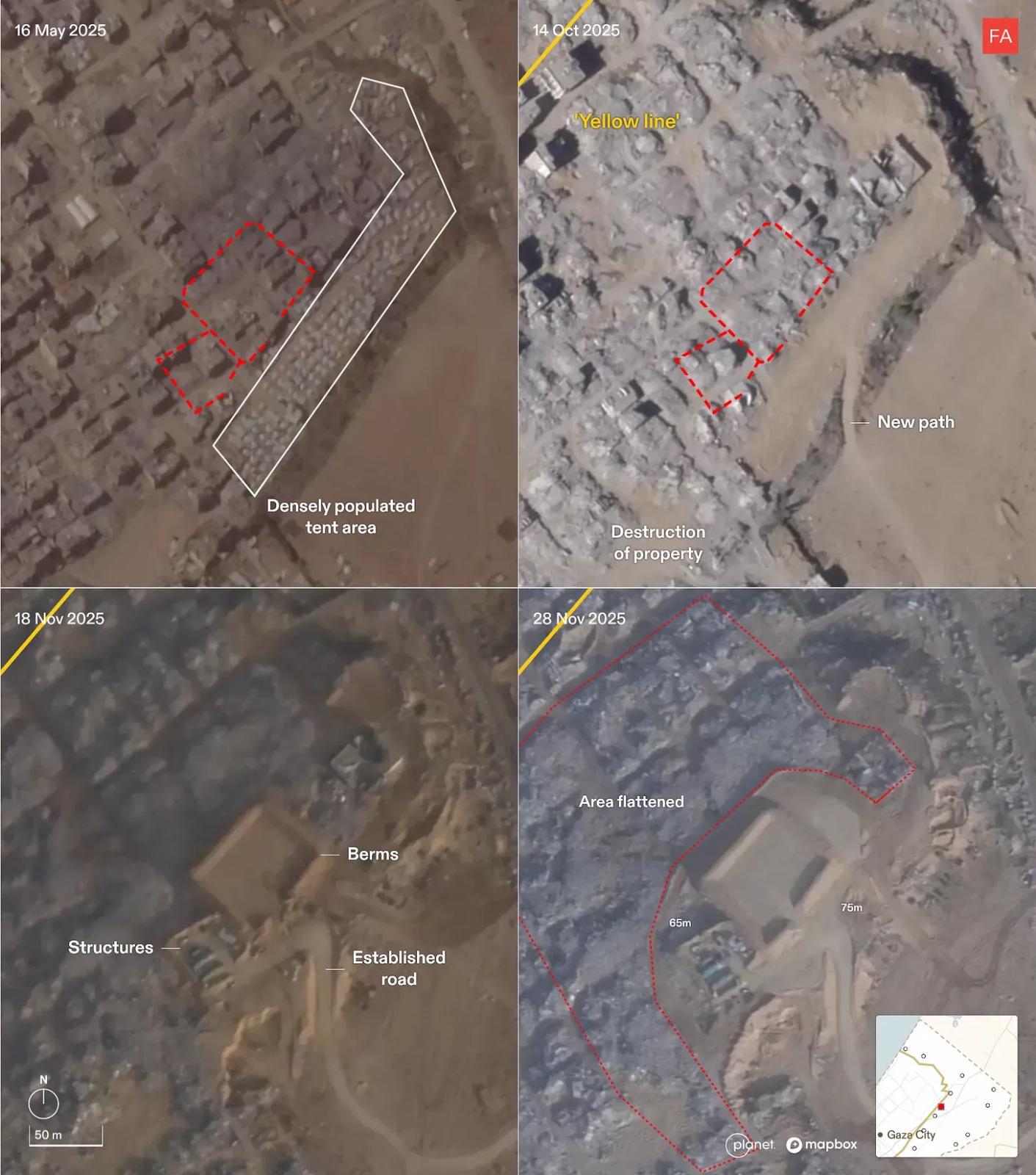 وبحسب التحليل، تسيطر إسرائيل حاليًا على أكثر من 50% من مساحة قطاع غزة، وتدير 48 موقعًا عسكريًا شرق ما يُعرف بـ«الخط الأصفر»، وهو خط إعادة الانتشار الذي حدده اتفاق وقف إطلاق النار. وتشير النتائج إلى أن هذه الإجراءات تمثل تغييرًا ماديًا في جغرافية القطاع، بما قد يمهد لوجود عسكري طويل الأمد.
