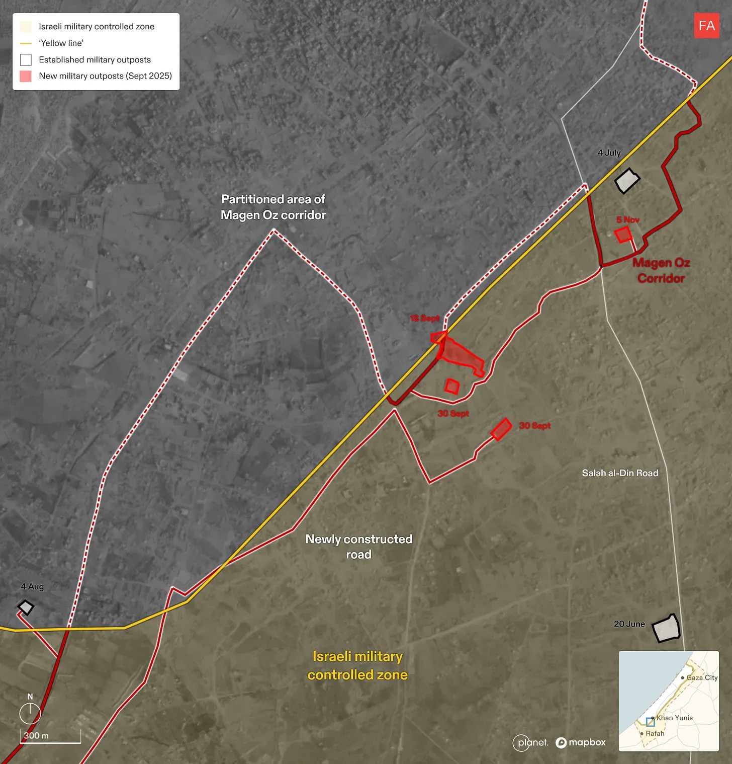 كما رصد التقرير استمرار العمل في طريق جديد في منطقة خان يونس، بدأ إنشاؤه في سبتمبر/أيلول 2025، مع إعادة توجيه ممر «ماغن عوز» ليقع بالكامل ضمن مناطق السيطرة الإسرائيلية.